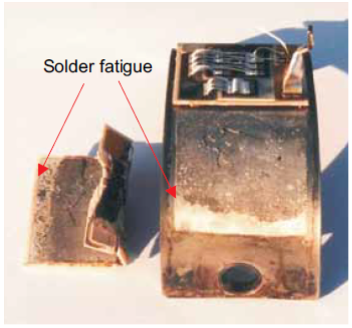 IGBT的一个主要失效机理与焊接层的热-机械疲劳有关。关键的交界面是芯片连接陶瓷基板的Die Attach层和陶瓷基板与金属底板之间的焊接层。在这样的位置,通常可以发现在两个界面上的热膨胀系数(Coefficient of Thermal Expansion)失配严重、并具有大的温度摆幅;并且对于陶瓷基板与金属底板接触来说,具有大的横向尺寸。IGBT模块中用作焊接层的常用材料是锡银,铟或锡铅合金。它们具有出色的电性能,并且作为软焊料,它们具有良好的流动特性。通常,焊接层被视为一个单一的均相,但事实并非如此,因为它们的相会随着时间而发生变化。例如,当将具有铜金属镀层的陶瓷基板与标准铅锡合金焊接在一起时,主要通过形成靠近铜层的Cu5Sn6合金层相来提供键合。在焊接层的部分形成了另外两个不同的相,一个富锡和一个富铅。在加速老化测试中,由于合金在较高的同源温度下工作,这些相迅速变粗,从而改变了其热机械性能;由于铜相比锡铅相脆得多,因此热机械疲劳裂纹常在富铜合金层间传播。由于较大的热膨胀系数(Coefficient of Thermal Expansion)失配和较高的温度,先在紧接在陶瓷基板下方的合金层附近发现疲劳裂纹。金相学研究表明,裂纹在焊接层的边界处开始,该处的切应力达到大。另外,在陶瓷基板的边缘处锐角的存在极大地促进了裂纹的形成。以上的过程,将会导致模块的热阻增加,这会导致IGBT的芯片过热,并加快其它失效的速度,以至于它们随后会产生失效。尽管大的接触面积是金属底板和陶瓷基板背面金属化层之间的焊接层,从九十年代末开始,可使用相对坚硬的、并具有接近陶瓷基板的CTE(如AlSiC材料)代替铜作为基板材料,在该区域产生热-机械应力可以大大减少。